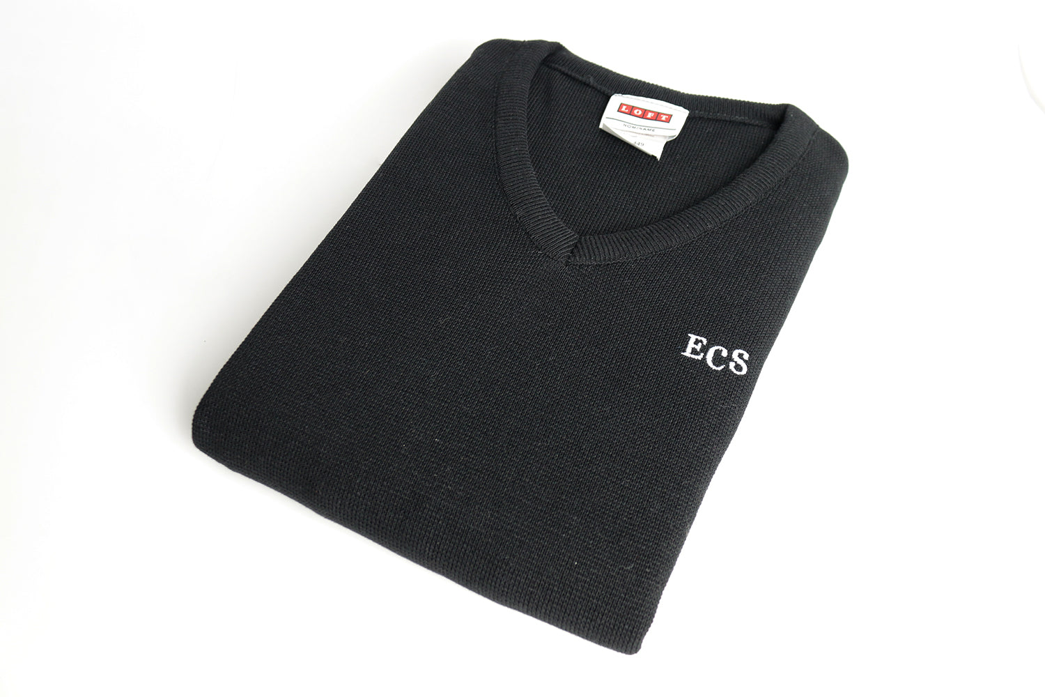 Black v-neck knit pullover with the ECS monogram. Tailored and elegant.