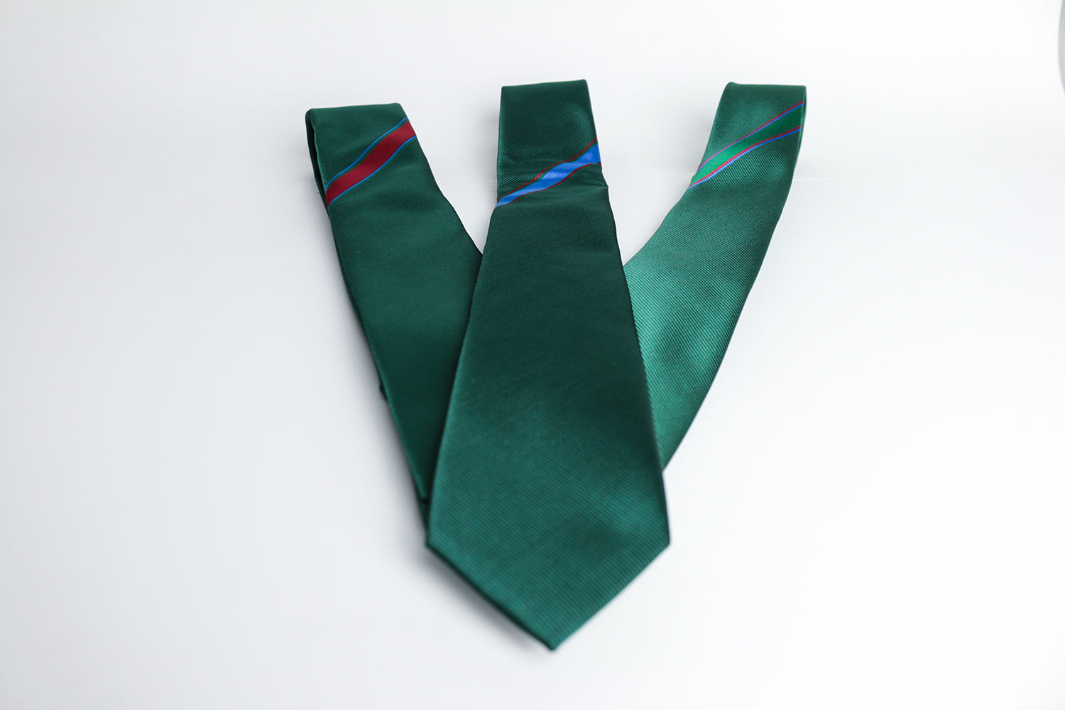 Dark green tie with a stripe across the front in the student's house colour. Worn by girls in grade 9 to 11 (except for House Officials and Prefects).